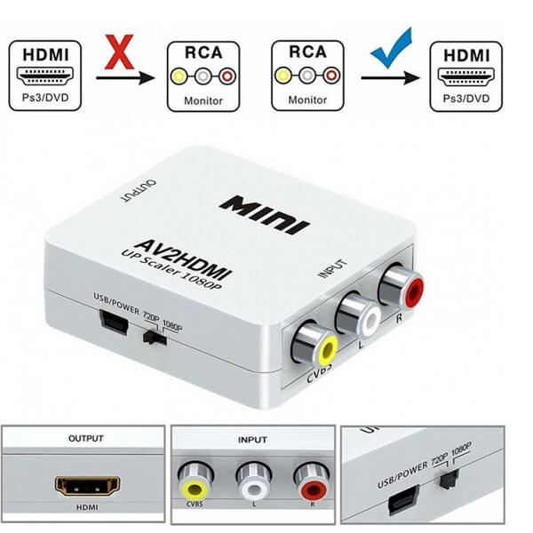 سه RCA را به درگاه HDMI تبدیل کنید. این دستگاه مبدل دارای ورودی برق ۵ ولت با کیت الکترونیکی درونی و چیپ قدرتمند، قادر